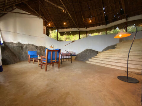 Rm8 & Rm9; These two rooms are under the same roof and they share a spacious and bright sitting room with stunning views over the lake. Space has been built around a huge rock, the biggest and most impressive of all the rooms. From the sitting room, there is access to a private deck overlooking the lake. Both rooms are independent and can be booked also by friends who want to share the same space. The master bedroom is simply beautiful and romantic and can be used as a honeymoon suite as well. The second bedroom has twin beds. Ideal for children or two friends. Both rooms have their own private en-suite bathrooms.